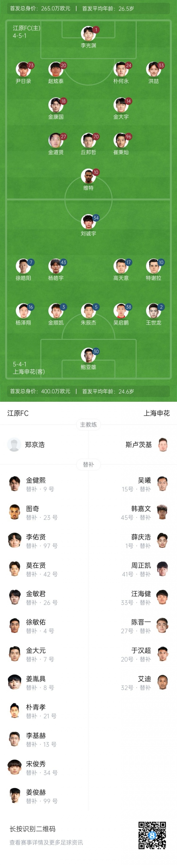江原FC首发:1-李光渊、20-赵炫泰、24-朴昊永、33-洪喆、14-金大宇、18-金康国、70-具本哲、10-维托尔·加布里埃尔(F)、27-金道现、73-尹日录、96-崔炳赞